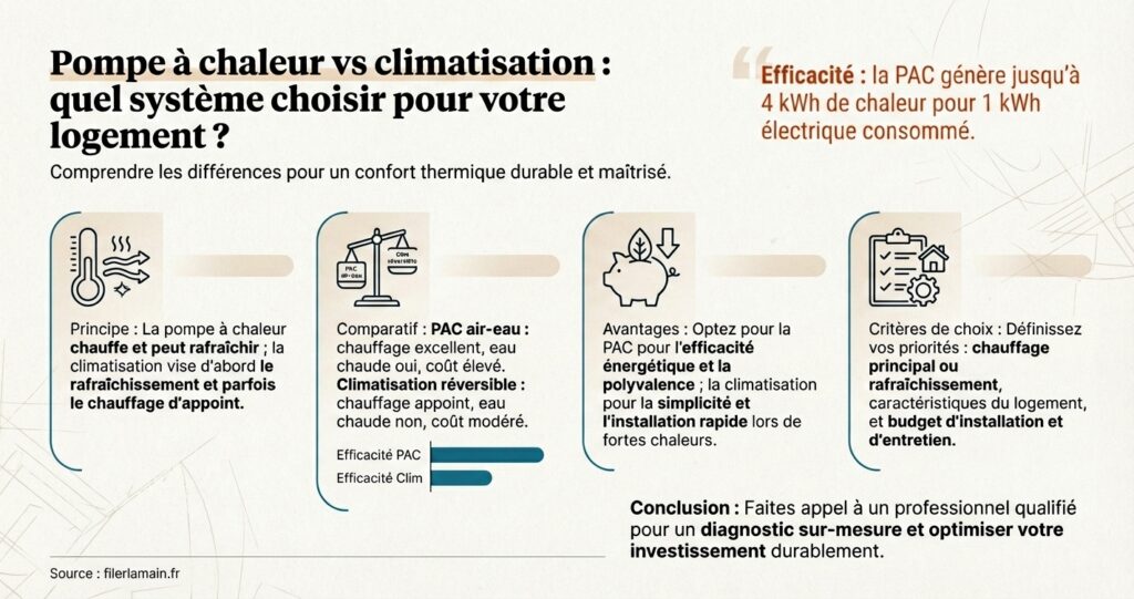 Le terme différence entre pompe à chaleur et climatisation revient fréquemment lors des comparaisons. Voici un tableau synthétique qui met en lumière les principales distinctions :
